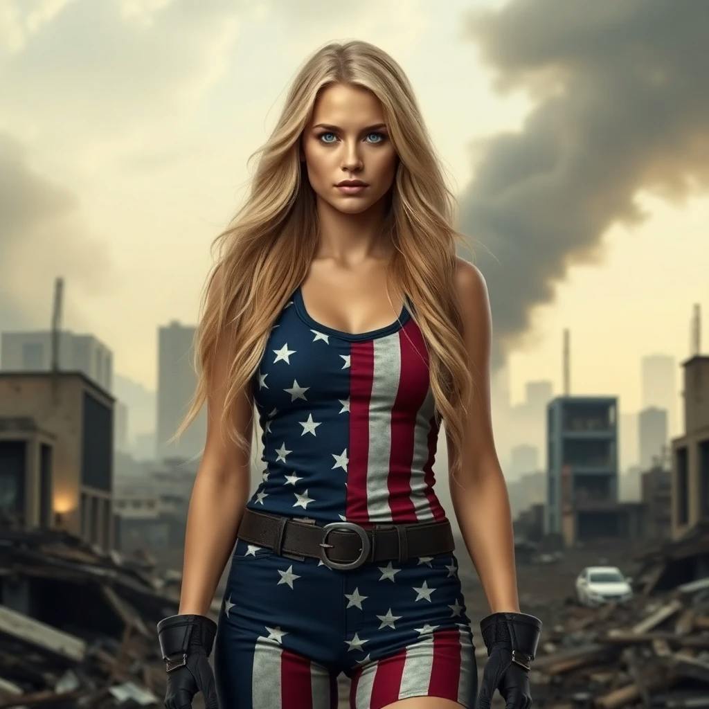 The air was thick with the stench of ash and the crackle of burning embers. Amidst the ruins of a once-vibrant city, the young woman clambered over the debris, her American flag-inspired attire tattered and stained. The world she had known had been reduced to a dystopian nightmare, a stark contrast to the promise of hope and prosperity she had once believed in.